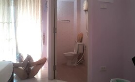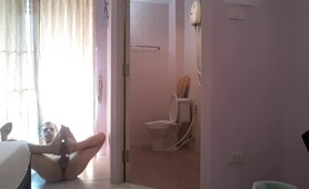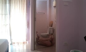 Hot European gives a great footjob and jerk off in the bathroom